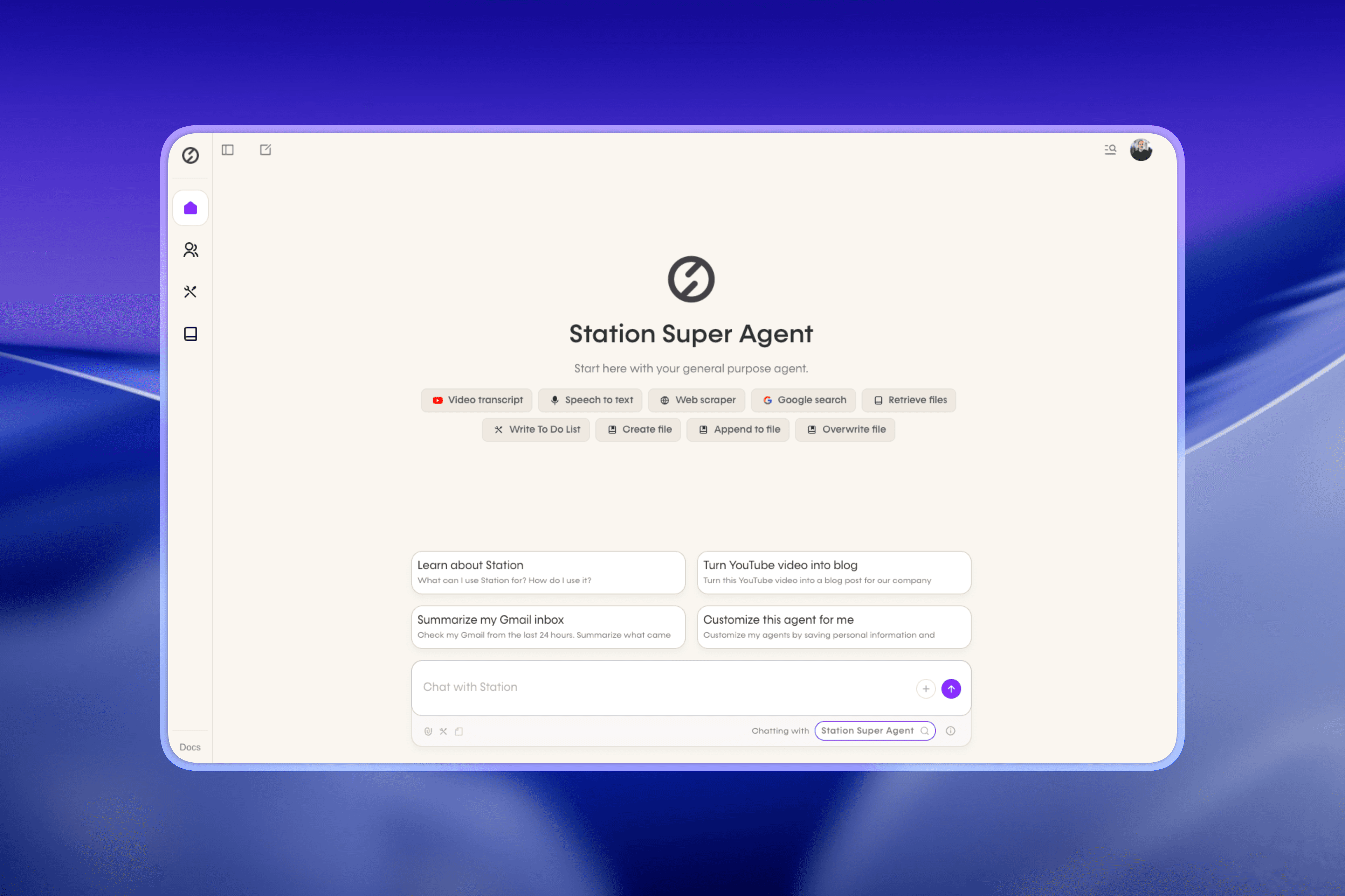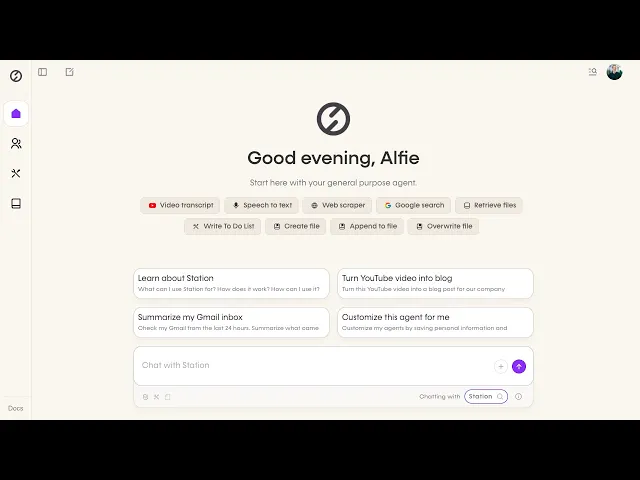 Station is a general purpose AI agent that handles any business task across 2,500+ apps. Built for non-technical teams, Station is highly customizable - using integrations, tools, skills, and sub-agents to work exactly how you need. It learns your company and gets smarter every day.